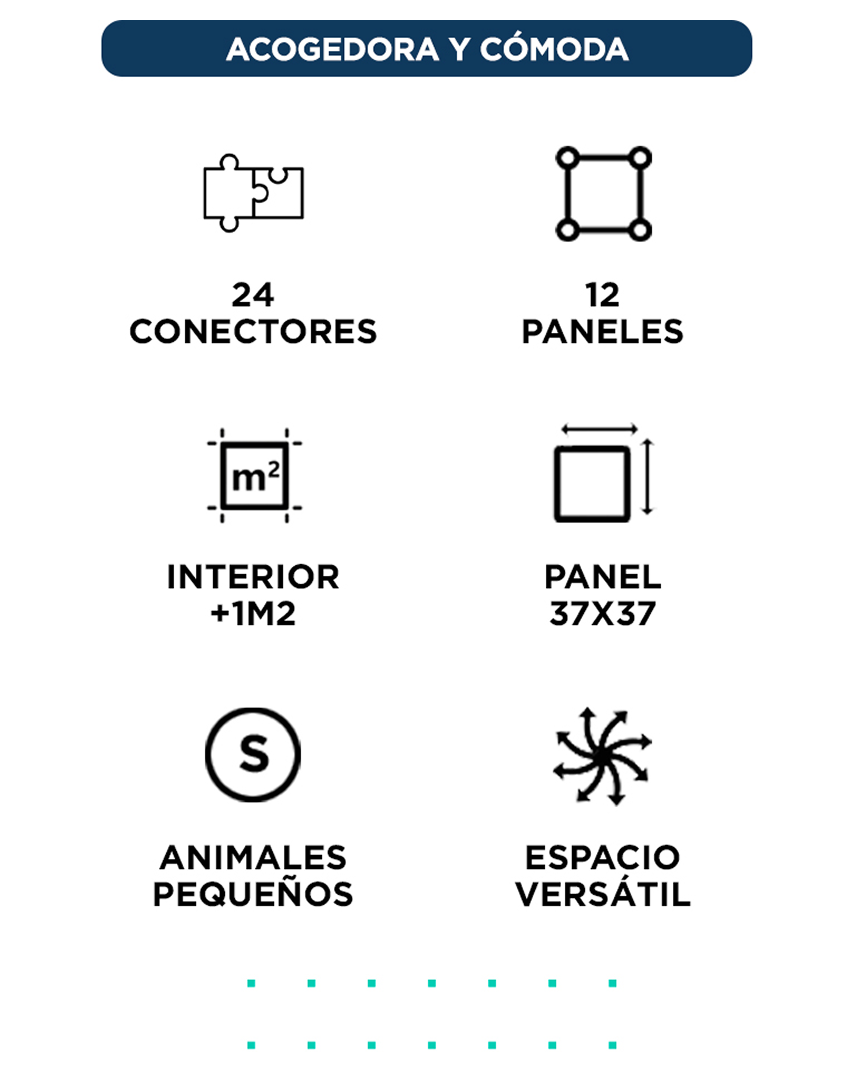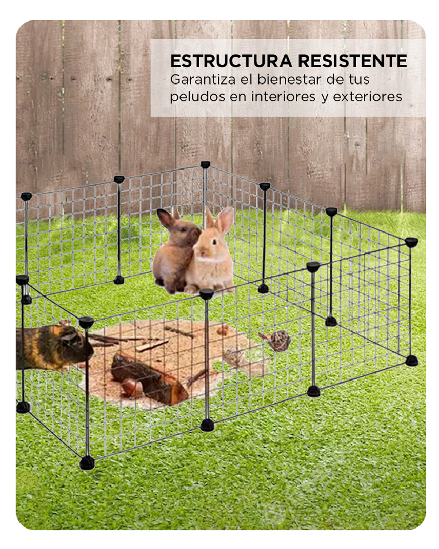 El Corral Jaula Gadnic brinda un entorno amplio y protegido para cobayos, conejos, gatos, erizos y otras mascotas pequeñas. Con más de un metro cuadrado de superficie interna, ofrece espacio suficiente para jugar y descansar. Su estructura metálica proporciona seguridad y estabilidad mientras la mascota explora. Es ideal para uso diario en interiores.