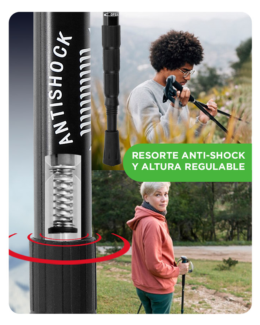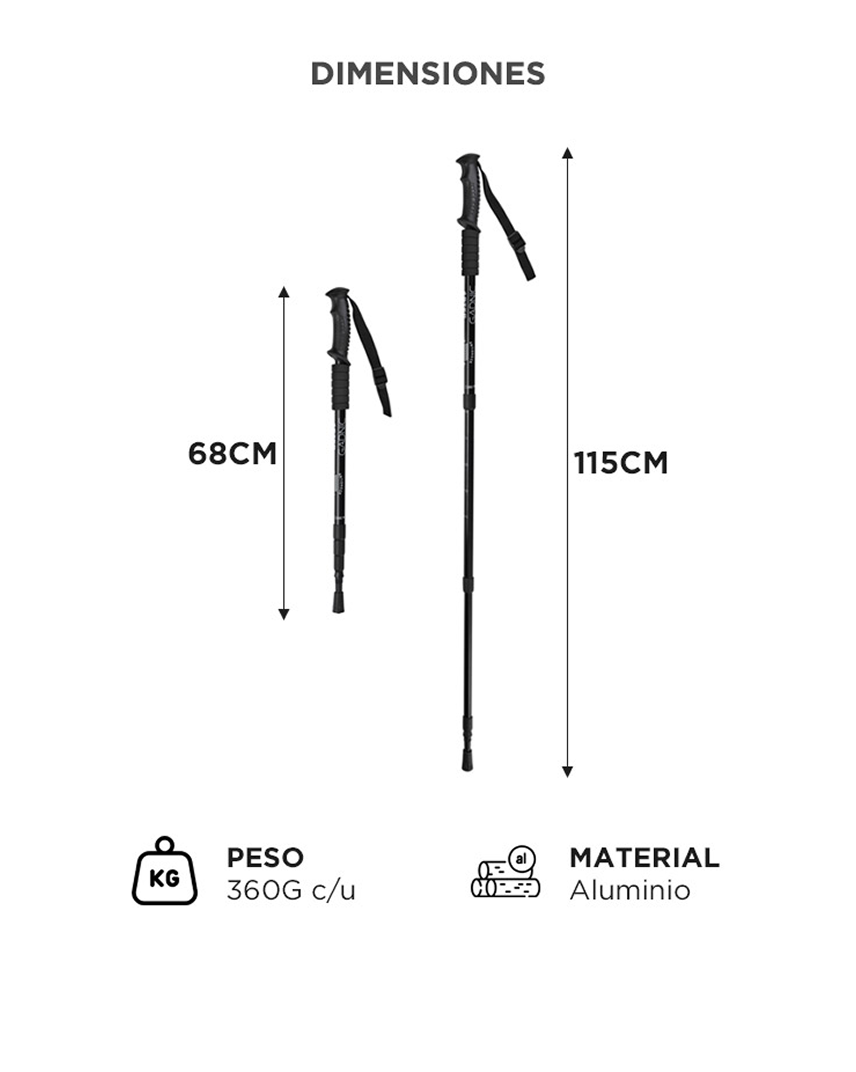 Fácil de usar: Para principiantes y excursionistas. Lo suficientemente fuerte como para soportar la presión y el impacto de cualquier terreno. Altura regulable: Podes regular la altura de los bastones de 68 a 115 cm. Cómodas empuñaduras: Proporcionan un agarre ligero y antideslizante junto con nuestra correa de muñeca ajustable.